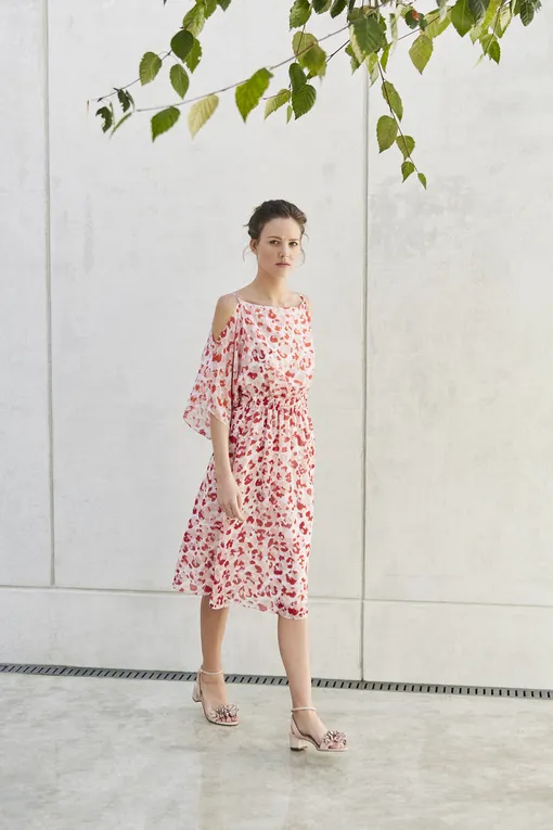 Дизайнеры вдохновились трендовой стилистикой 50-х и 80-х годов: силуэты «нью-лук», объемные юбки из поплина, приталенные платья с расклешенными подолами, заниженная линия плеч и широкие рукава три четверти.