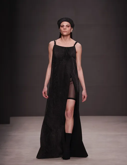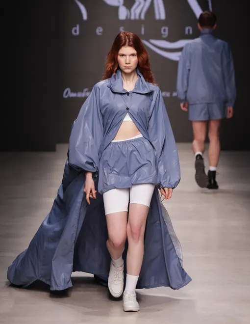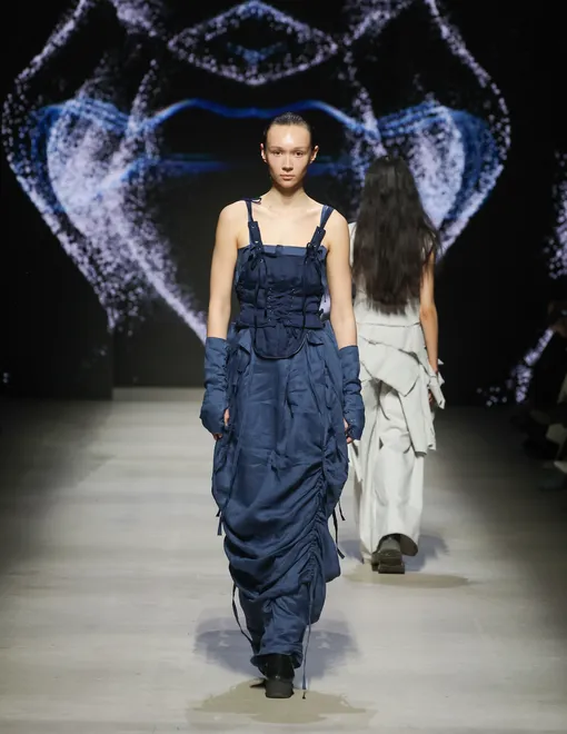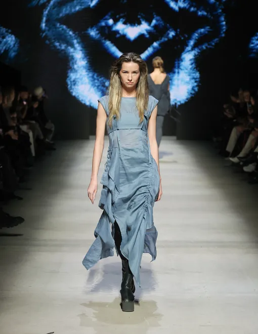 Раскрывает тему модернизированного этноса бренд Abzaeva из Улан-Удэ. Надежда Абзаева, главный дизайнер модного дома, чтит традиции и культурный код Бурятии, представляя локальную идентичность в современном прочтении. Основной особенностью коллекции стала фактура: она образовывалась и за счет контрастных нашивок, и длинных завязок, и хаотичной шнуровки, а также благодаря драпировке. Именно игра с фактурой создавала ощущение многослойности, даже если мы видим только одно изделие. Дух колоритной Бурятии особенно передают рукава О-силуэта и приглушенная палитра: черный, пепельный, темно-голубой, бирюзовый, сапфировый стали ключевыми оттенками в коллекции.