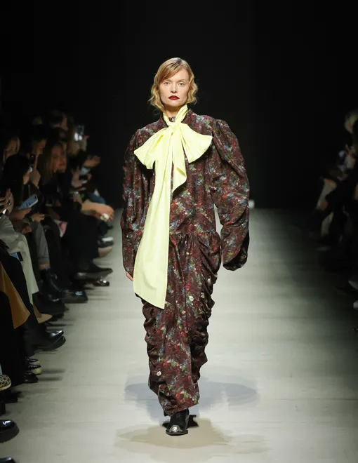 Алена Мусаева и ее одноименный бренд славятся тягой к фольклору, историзму и самобытности народов — это и есть айдентика бренда. Но в новой коллекции дизайнер решила сделать ставку на эксперименты: они коснулись и цветовой палитры, которая стала ярче и насыщеннее (приглушенные гаммы разбавили алый, солнечно-желтый, травянисто-зеленый, насыщенно-голубой), изделий и фактуры. Корсеты нашивались на жакеты и рубашки, расслабленные платья с флористическими мотивами сочетались с горгерами, которые обычно добавляли к нарядам в XVII веке.