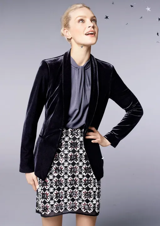 Если ты не планируешь экстравагантных выходов, обрати внимание на элегантное сочетание фактур в образах S.Oliver Black Label. Стоимость бархатного пиджака — 9 100 рублей, юбки с пайетками — 6 500 рублей.