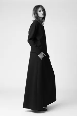 Ночь, бессонница, шампанское, прогулки под луной и мистическая вечеринка — все эти составляющие превратились в осенне-зимние комплекты Alexander Terekhov, предназначенные, впрочем, не только для выходов в свет. Конечно, центральное место в ней отведено вечерним платьям: черным (преимущественно) и белым, из бархата и принтованного хлопка, украшенного пайетками и кристаллами Swarovski. Однако на равных с ними в коллекции сосуществуют уютные пуховики, объемные пальто, простые юбки и топы.