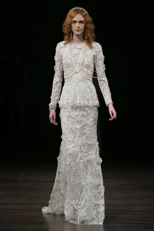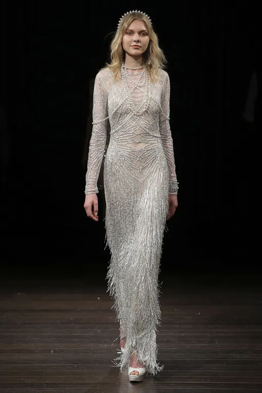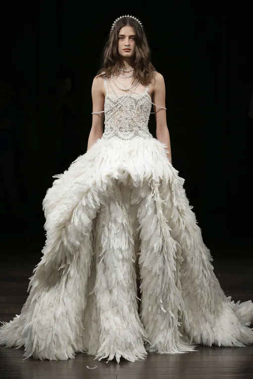 Для любительниц «ревущих 20-х» у Naeem Khan есть платья-флэпперы: длина, конечно, как полагается на свадьбе, в пол, а не чуть ниже колена, но в остальном — и бахрома из бисера, и геометричные вышивки в духе ар-деко, и перья на подоле — стилистика соблюдена.