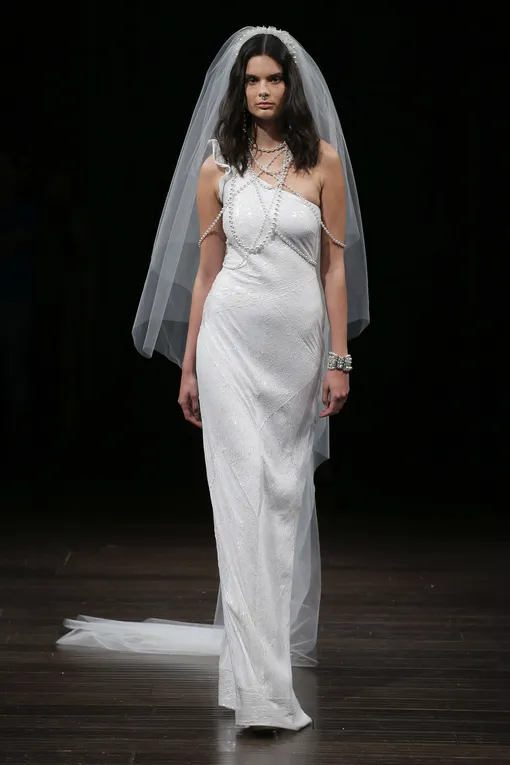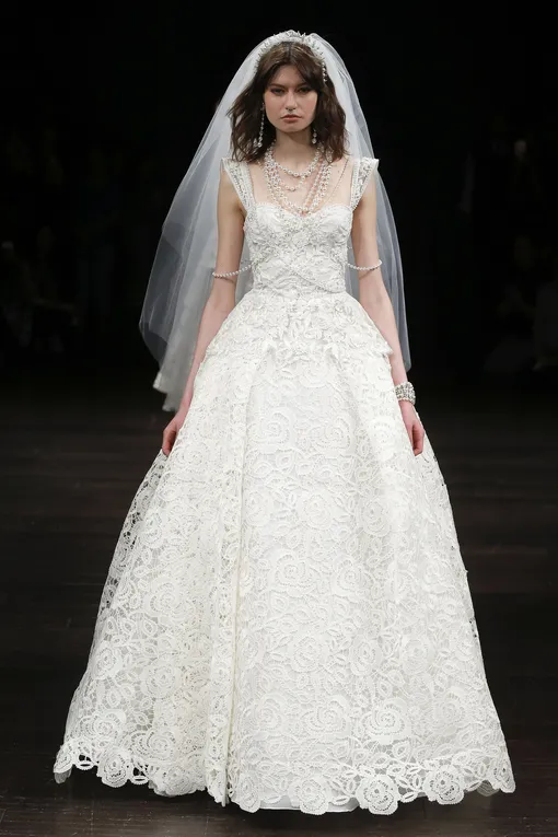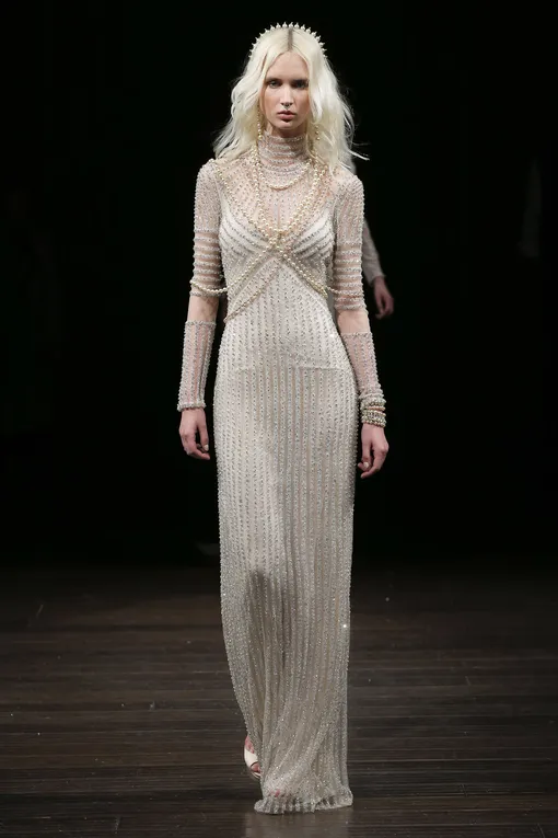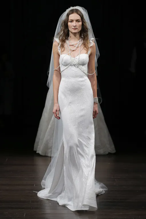 Главной стилистической находкой коллекции стали хитросплетенные нити жемчужных бус, опоясывающие плечи моделей несколько раз и скрещивающиеся на груди. Этот прием стоит взять на заметку не только на случай венчания, но и вообще для торжественных случаев и вечеринок.