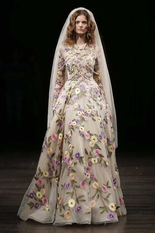 Ну а в финале коллекции и без того романтичная история была дополнена цветочными свадебными платьями, напоминающими наряды Офелии. Безусловная романтика.