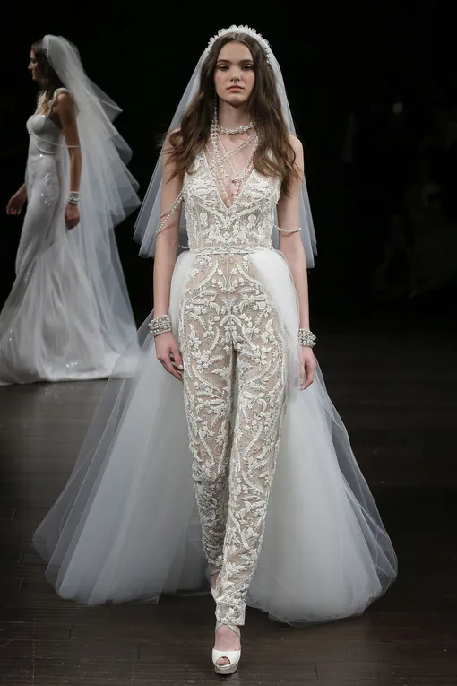 Марки, специализирующиеся на свадебной моде, активно выпускают коллекции на 2018 год: все должно быть готово заранее, чтобы будущие невесты заблаговременно сделали заказы и получили пошитые по индивидуальным меркам подвенечные наряды в срок. Представленная Naeem Khan коллекция явно адресована широкому кругу невест: здесь есть и женственные подолы в обновленном духе new look, и пышные туалеты с кружевом, перьями и вышивкой, и лаконичные белые платья, украшенные только россыпями жемчуга, и даже комбинезоны.