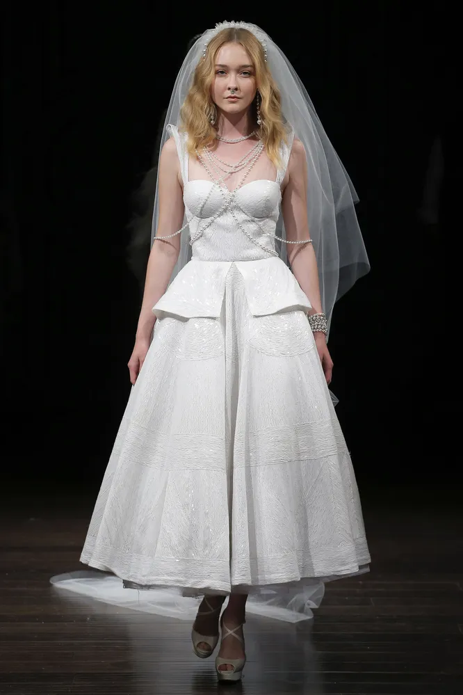 Для любительниц «ревущих 20-х» у Naeem Khan есть платья-флэпперы: длина, конечно, как полагается на свадьбе, в пол, а не чуть ниже колена, но в остальном — и бахрома из бисера, и геометричные вышивки в духе ар-деко, и перья на подоле — стилистика соблюдена.