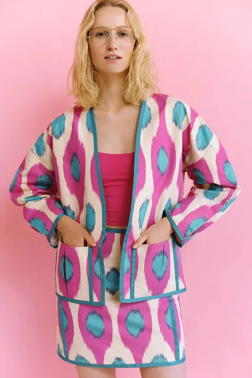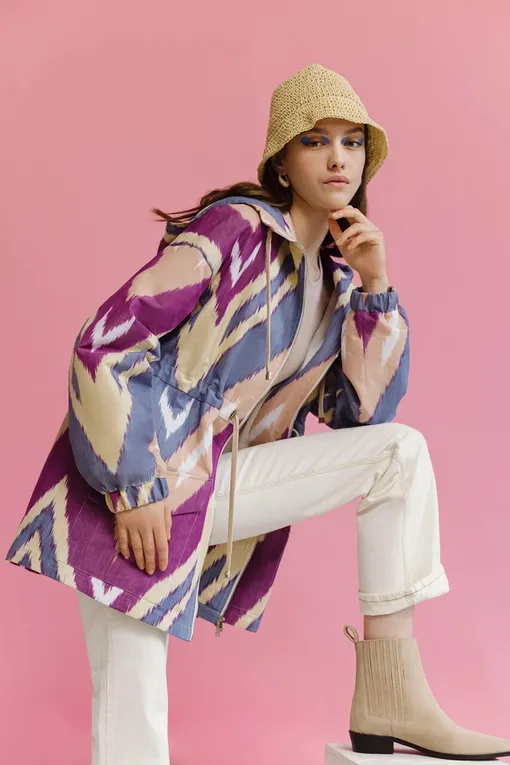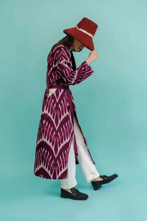 -во-вторых, восточная традиция нашла классное исполнение в casual-образах. Значит, что «икаты» идут не на традиционные кафтаны, как это делают обычно, а на платья блузки, мини-юбки, тренчи, пальто, бомберы и другую повседневную одежду;