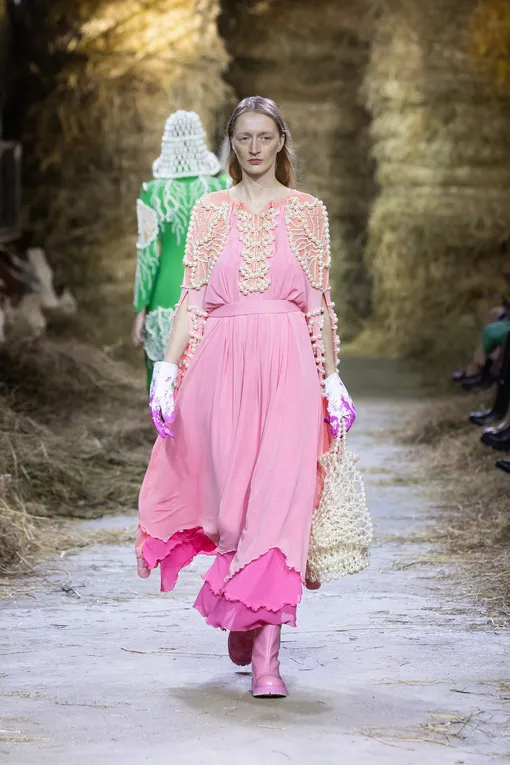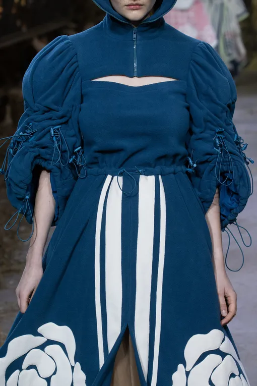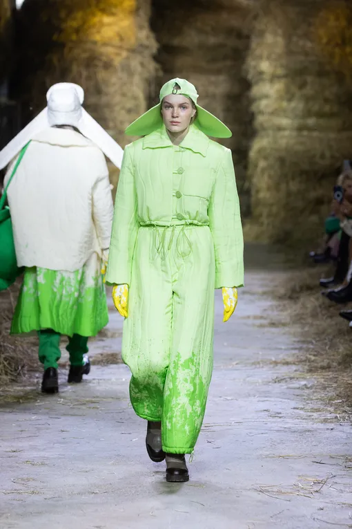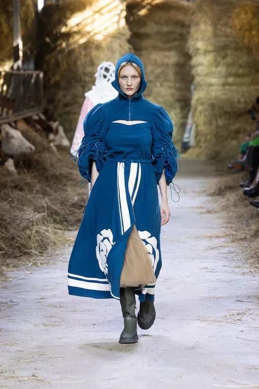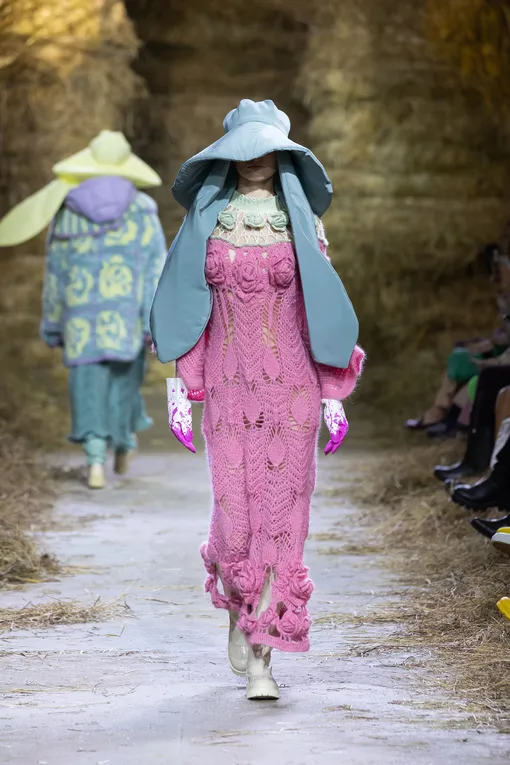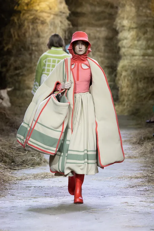 Классический образ огородника из прошлого, закутанного в байковое одеяло, стал вдохновением для четвёртого блока коллекции. Один из самых актуальных материалов — флис — воплощается в гиперобъемные формы, дополненные спортивными и утилитарными деталями. Лук, составленный из двух шуб: норковой в мелкий росшив, напоминающий вязаную фрактуру, и велюровой розовой, накинутой сверху, как одеяло, представляет прочтение брендом тренда на outwear.