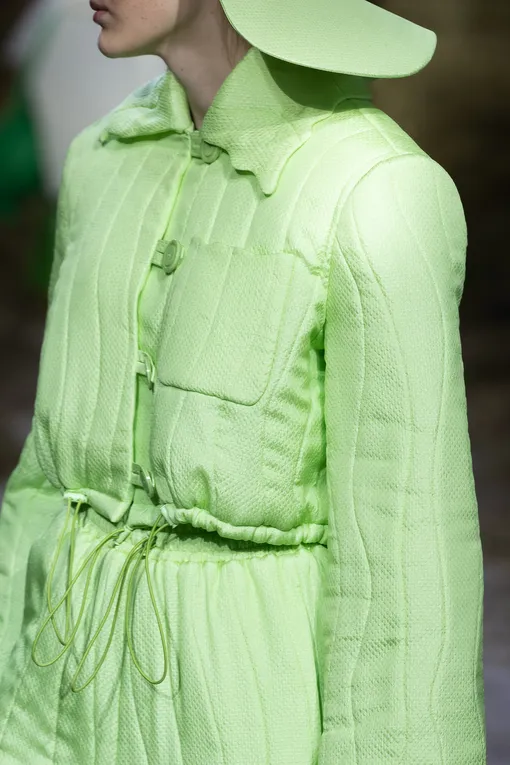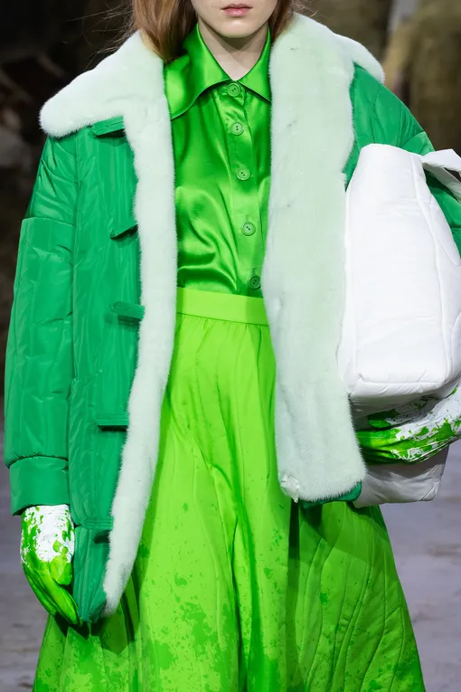 Второй блок посвящён знаковым приёмам бренда — принту и стёжке. Дутые объемные формы традиционной русской фуфайки, дополненные волнистой стёжкой, вдохновлённой линиями листьев капусты, контрастируют с выбранными материалами — плотный и полупрозрачный вечерний шёлк. Палитра блока построена на сочетании белого и фирменного зелёного: принт напоминает как будто испачканные землей вещи поклонников стиля «новых огородников». Кульминации тема этого блока достигает в шубе из норки Saga Furs, где имитация стежки выполнена за счёт росшива меха замшей, а цветовые пятна — за счёт техники интарсии.