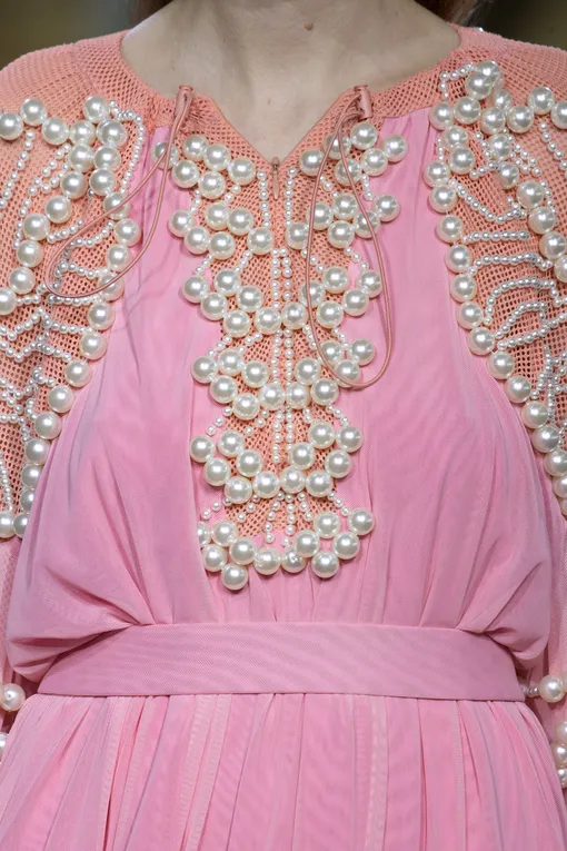 Завершающий пятый блок — кульминация выражения ДНК бренда в коллекции: платья с вышивкой жемчугом в русском стиле с мотивами капусты и лошадей и сложные аксессуары, плетёные из жемчуга. Akhmadullina демонстрирует своё видение вечерней темы, вводя актуальные спортивные детали — крой олимпийки, кулиски — и нетипичные для этого сегмента материалы: плотный хлопок и спортивную сетку. Дополняет картину белоснежный объёмный пуховик из ворсистой пальтовой ткани, расшитый розовым жемчугом.