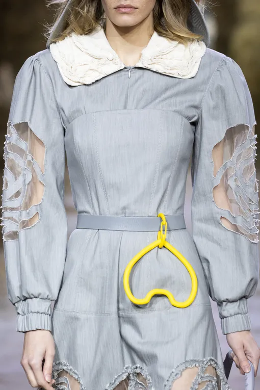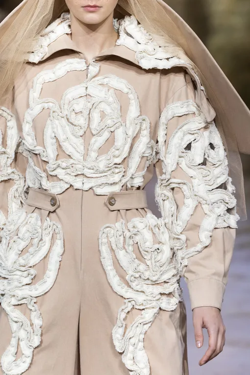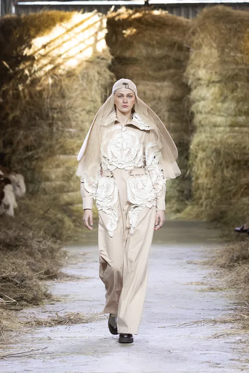 Первый блок из денима решён в очень спокойной гамме: розовато-бежевый, серый, молочный — натуральные комфортные цвета. В декоре используется характерная для бренда техника — «разбахромленные» полоски ткани настрочены по волнистым линиям, символизирующим биоморфную структуру капусты, главного мотива коллекции. Из денима выполнены не только характерные для этого материала позиции — комбинезон, брюки, куртка, но и корсетные вечерние платья, а также головные уборы — косынки, кепки гипертрофированного объема и сумка-ведро.