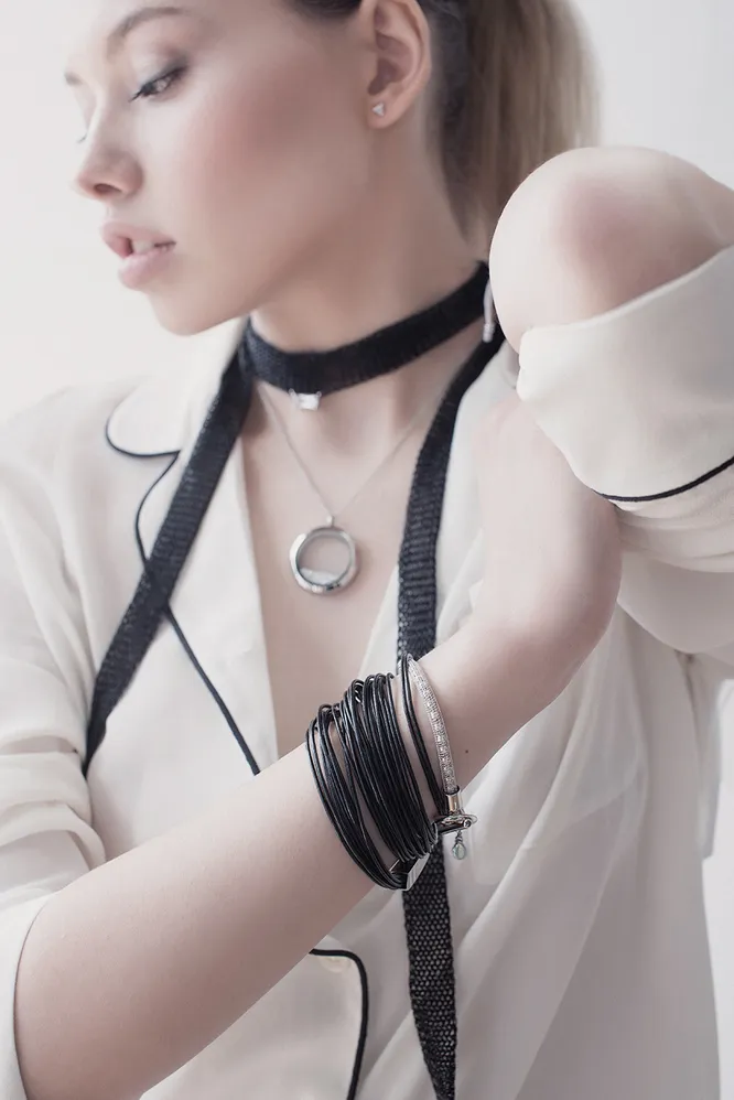 Основу коллекции составили моно-серьги, чокеры из кожи и плетеной металлической тесьмы, многослойные колье и браслеты из «кружевного» металла.