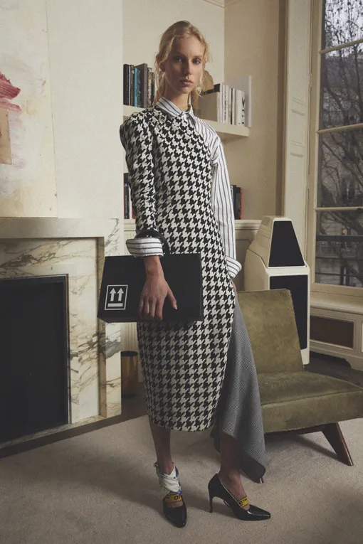 Наиболее подробно процитированы 80-е и 90-е: от офисных костюмов в «гусиную лапку» и платьев-комбинаций до спорт-шика, от верхней одежды с брендингом до заигрывания с униформой. Таким образом, интерпретируя графическую эстетику Off-White, Вирджил привлекает как молодежь (которая еще не столкнулась с «офисным дресс-кодом»), так и женщин, которые ищут способ осовременить свою повседневную элегантность.