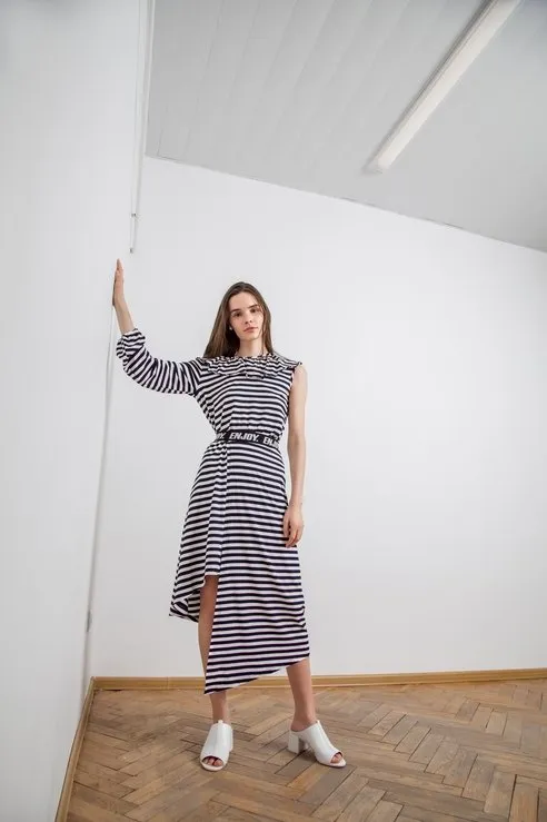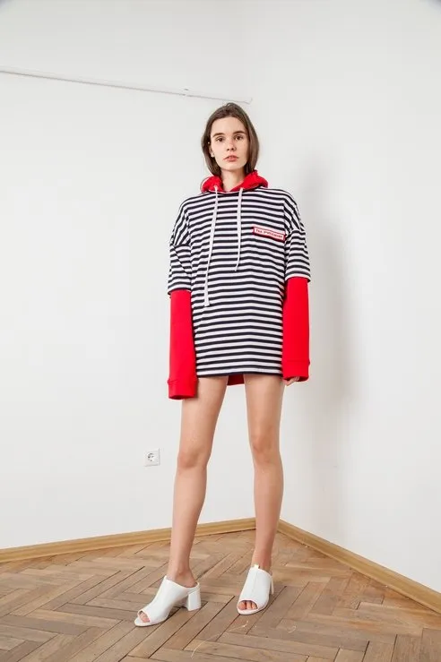 В коллекции представлены довольно интересные модификации самого актуального паттерна сезона, полоски, — что-то между классической «тельняшкой» из Военторга и тюремной робой с нашивкой «Ты Русский» на сердце (привет, «пацанская» тематика восточной Европы, на которую был бум в 2016 году).