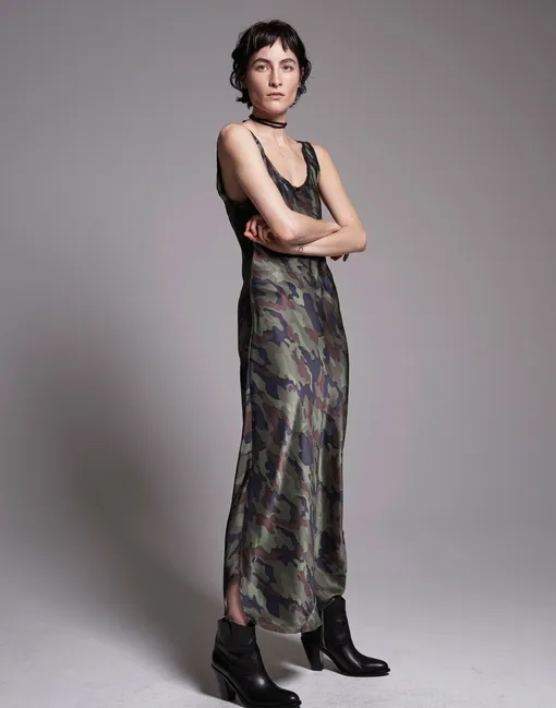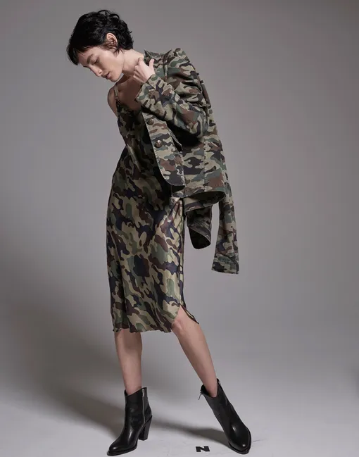 Камуфляжный принт украшает в основном тонкие сатиновые ткани, создавая образ хрупкий и даже нежный.