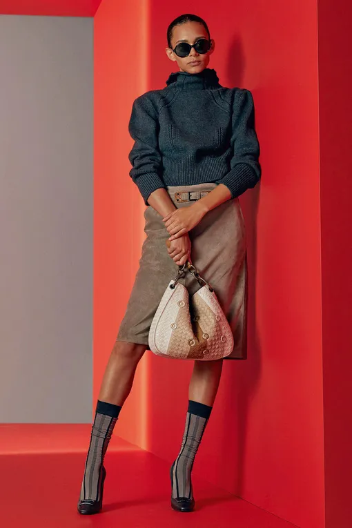 В дополнение к верхней одежде у Bottega Veneta нашлись теплые свитера со слегка увеличенной линией рукава и кожаные юбки.