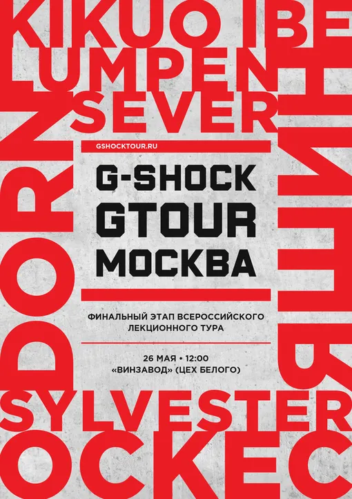 За плечами проекта G-SHOCK TOUR скопилась целая история! Уже три года культовый бренд часов на одной платформе собирает людей, формирующих сегодняшнюю индустрию. Лекции, мастер-классы, открытое общение – GTOUR успел прокатиться по многим городам России, включая Нижний Новгород, Уфу, Сочи, Казань, Новосибирск, Екатеринбург, Красноярск, Челябинск, Иркутск, Севастополь, Омск и даже Владивосток. Москва – станет заключительной и самой громкой остановкой проекта.