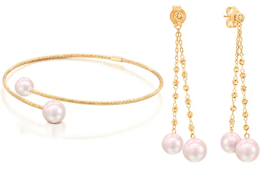 Первый лот – серьги-подвески с чарующими белыми сферами морского жемчуга Акойя, выполненые из желтого золота 750-пробы. Второй – браслет в форме жесткого не замыкающегося обруча. Акцентом украшения из желтого золота 750-пробы весом 3,1 г диаметром 60х50 мм являются великолепные жемчужины 6,5-7 мм и 8-8,5 мм – каждая как маленькое произведение искусства.