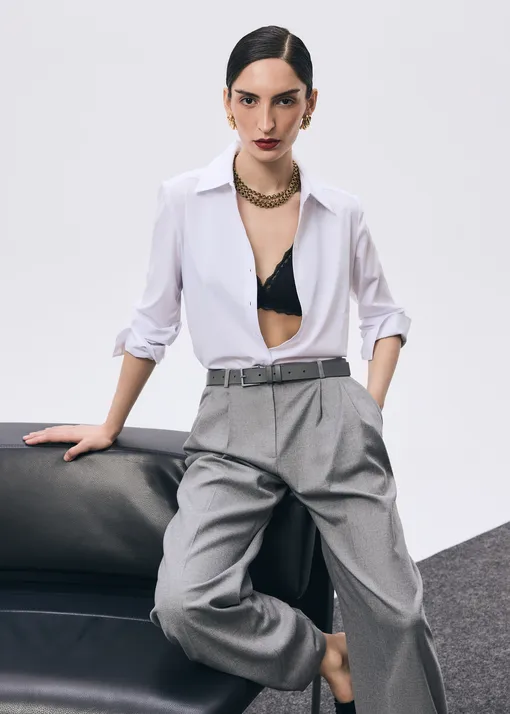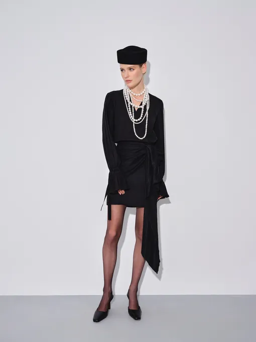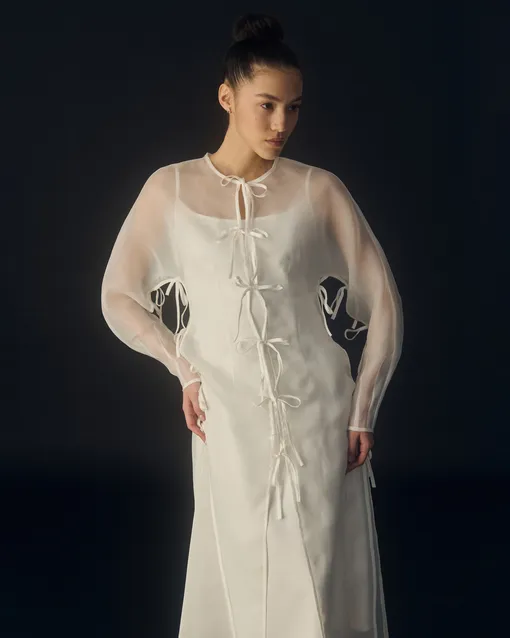 Легкая небрежность, многослойность и ощущение движения — основные интонации этой капсулы. Материалы контрастируют друг с другом: плотные, структурные ткани на основе вискозы встречаются с воздушной, полупрозрачной органзой, создавая игру фактур, глубину и визуальную легкость.