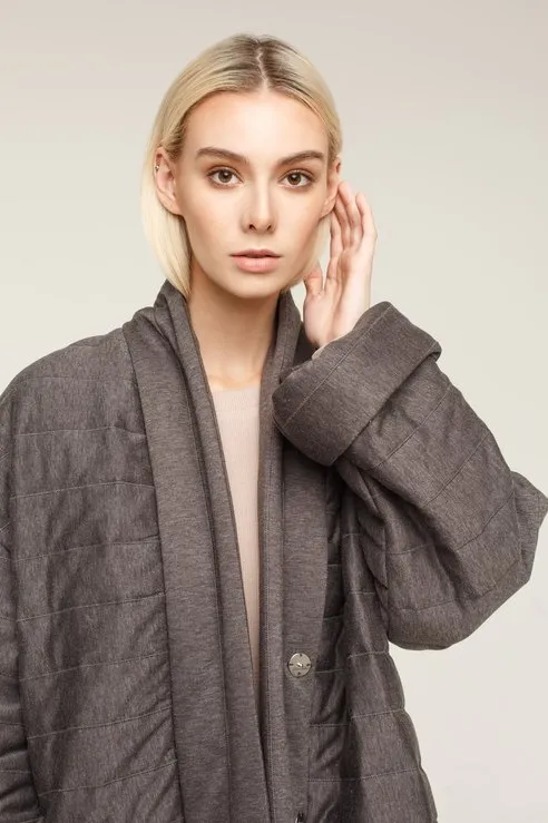 Состав: 65% тенсел, 30% рамий, 5% спандекс; подклад: 50% вискоза, 50% терилен; утеплитель — синтепон. Цвета: серый, графит. Стоимость: 7900 рублей.