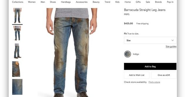 Пока модники удивлялись полностью прозрачным пластиковым брюкам от Topshop, сеть американских магазинов Nordstrom решила пойти ещё дальше. Бренд представил новинку — мужские джинсы, которые выглядят так, словно их владелец все выходные провёл на ферме или же принимал грязевые ванны (причём прямо в одежде).