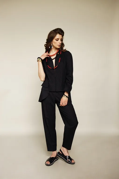 Воздушные блузы, свободные жакеты, брюки, платья и костюмы отвечают общей задумке марки – созданию «умного гардероба». Особое внимание дизайнеры уделили комбинезонам: их в коллекции три, и они совершенно разные по настроению и создаваемым образам.Черный больше подойдет для деловых встреч, а белый и голубой – для вечерних коктейлей.