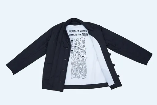 Супертелогрейки выпущены в двух цветах: пастельном rose quartz и классическом navy blue. На подкладке — принты художников Валерия Чтака, Кирилла Кто и Марии Евтодиевой. Кроме курток капсула содержит незабываемый (и очень удобный!) хит советского детства — варежки на резинке!