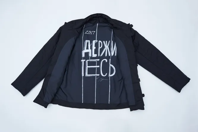 Супертелогрейки выпущены в двух цветах: пастельном rose quartz и классическом navy blue. На подкладке — принты художников Валерия Чтака, Кирилла Кто и Марии Евтодиевой. Кроме курток капсула содержит незабываемый (и очень удобный!) хит советского детства — варежки на резинке!