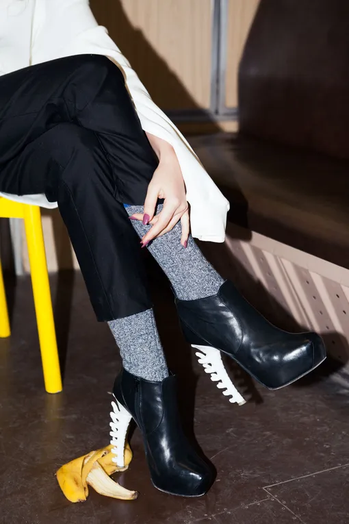 Брюки с лампасами, толстовки оверсайз, баска поверх пальто, шапка-пузырь, оригинальные каблуки и знакомое всем с детства сочетание шлепанцев и носков (с забавной надписью на кириллице) — дизайнеры Ushatava демонстрируют, как «одним легким движением руки» можно создать из спокойного элегантного гардероба ультрасовременный лук в лучших традициях не сходящих с первых полос глянца Гвасалии и Рубчинского.