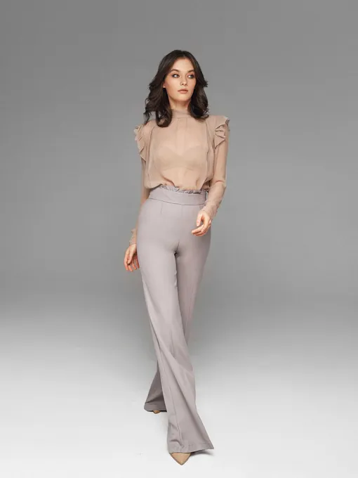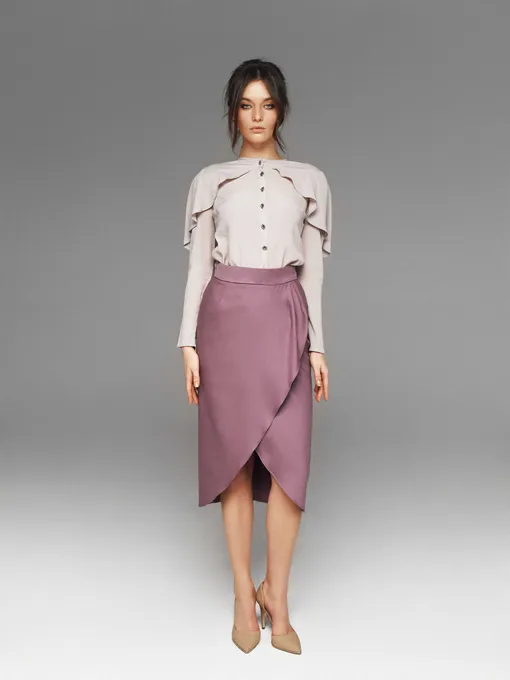 Элегантная и женственная классика представлена в приталенных брючных костюмах, юбках-карандаш и платьях. Главной особенностью коллекции стали расклешенные силуэты и драпировка, подчеркивающие нежность и воздушность женского тела.