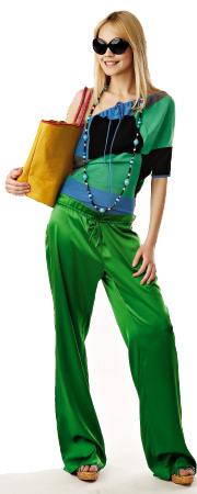 Я предлагаю носить боди с атласными брюками свободного кроя. В этом комплекте ты будешь чувствовать себя комфортно и в городе, и на отдыхе. Сочетай самые яркие цвета этого сезона, желтый, синий, зеленый, это создаст летнее настроение! Для того, чтобы придать образу женственности, добавь к комплекту длинные бусы. А сумку возьми яркую и вместительную – с ней тебе будет удобно и она отлично подходит к этому комплекту по стилю. И не забудь очки-бабочки – это один из самых трендовых аксессуаров! 1. Боди, Louise Goldin, 29 800 руб. 2. Очки, Escada, 9315 руб. 3. Бусы, Accessorize, 6083 руб. 4. Сумка, Armand Basi, 2850 руб. 5. Босоножки, D&G, 22 950 руб. |