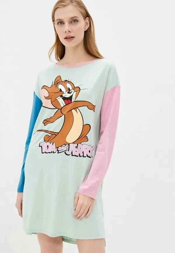 Любишь забавные и уютные вещи? Тогда тебе точно стоит примерить ночную сорочку с мультяшным принтом. Длинные рукава, расцветка колор-блок и свободный крой делают вещь просто незаменимой в твоем домашнем гардеробе.