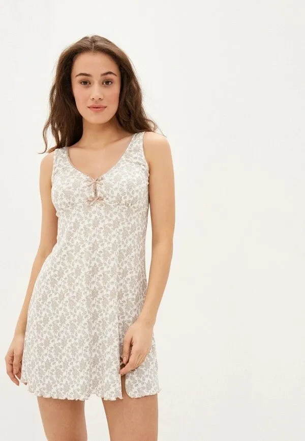 Укороченная ночная сорочка из эластичной синтетической ткани хорошо сидит на любой фигуре. Дома ее можно сочетать с мягкими пеньюарами или длинными халатами.