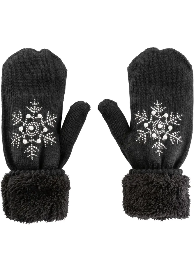 Черные вязаные варежки со снежинками и плюшевой отделкой станут классным дополнением к светлым пуховикам, белым шубам и дубленкам. Модель имеет подкладку из искусственного меха, которая будет отлично согревать руки и удерживать тепло. С такими перчатками носи светлую шапку с меховым помпоном или панаму из меха и объемный теплый шарф – в таких аксессуарах ты точно не замерзнешь!