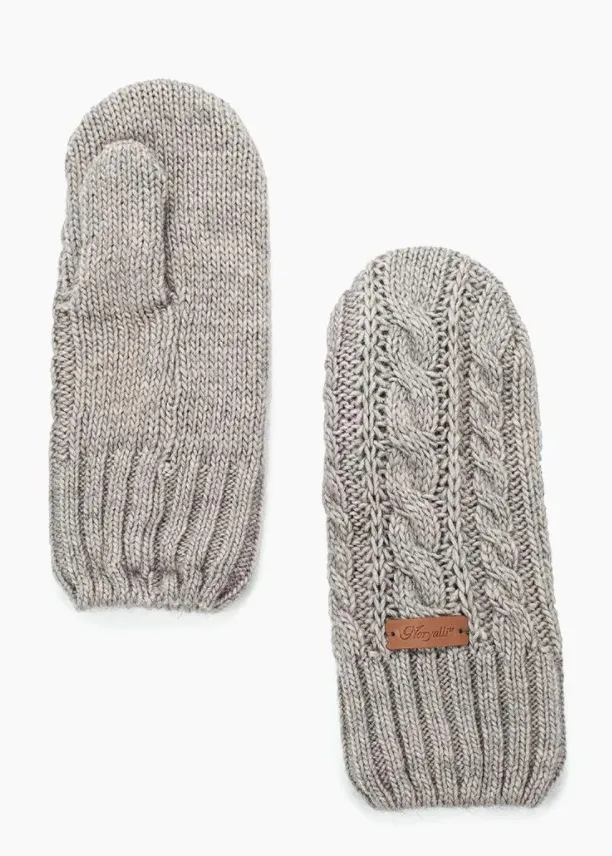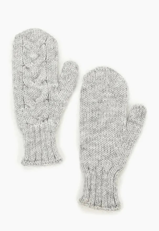 Универсальной парой под любую верхнюю одежду станут серые варежки с крупными косами. Модель идет без подкладки, но имеет хороший состав: 50% — натуральная шерсть и альпака. Пара хорошо сочетается как пуховиками и куртками, так и с элегантными пальто, шубами и дубленками. Шапку и шарф следует выбирать контрастных цветов, например белого, черного, пастельных оттенков, чтобы аксессуары не сливались в одно серое пятно.