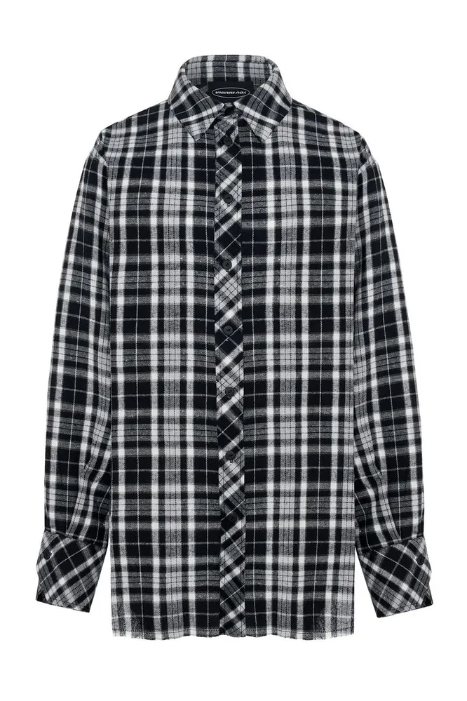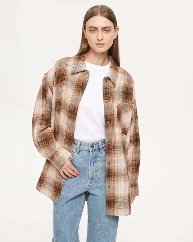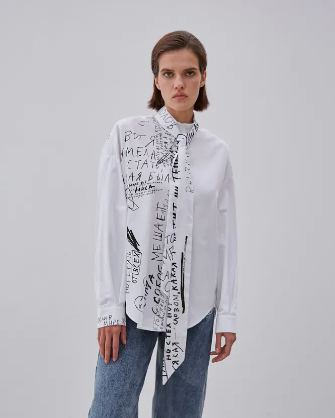 Остромодные принты быстро выходят из моды, поэтому на них при поиске «долгоиграющей» рубашки не рассчитываем. А вот абстрактные узоры (надписи, геометрия) и клетка не подведут — модели «в квадратик», кстати, круто впишутся в аутфиты с казаками и джинсовкой / кожанкой. Бохо!