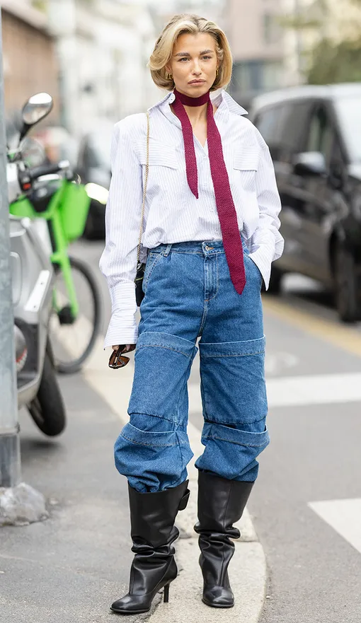 Обувь с острым мысом тоже можно сочетать с бэгги, если она на каблуке. Наш любимый прием – заправить широкие штанины в сапоги-слаучи. Два тренда в одном аутфите, обожаем!