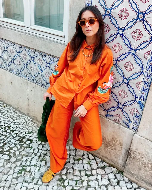 Пижамный костюм с сабо и, скажем, плетеным тоутом – классное сочетание для отпускных променадов по европейским улочкам. Тот же костюм, но уже с нарядными босоножками или мюлями (недавно, кстати, делали подборку) плюс клатч и украшения с крупными кристаллами – и ты готова к романтичному ужину.