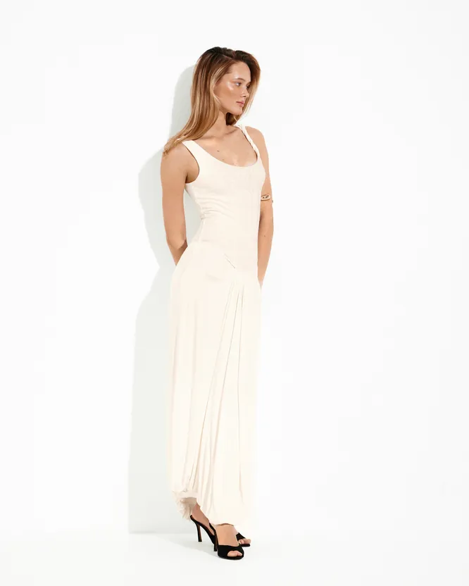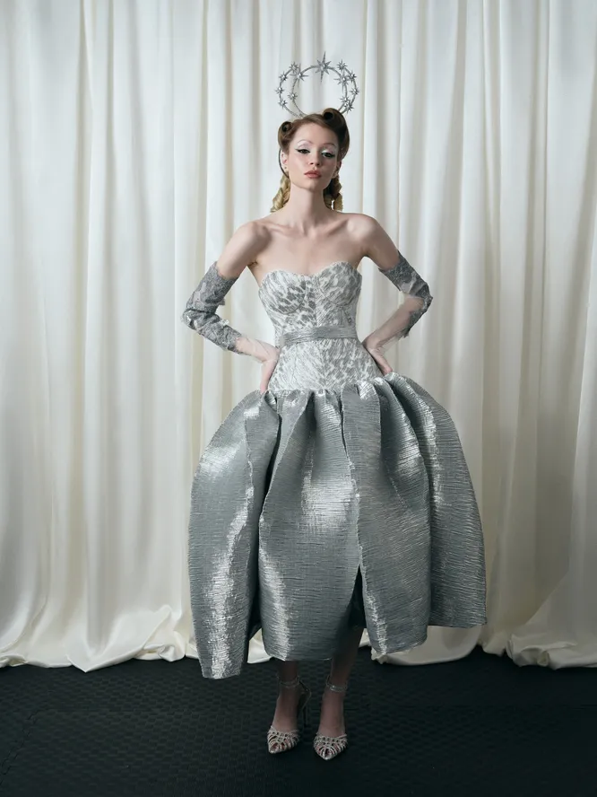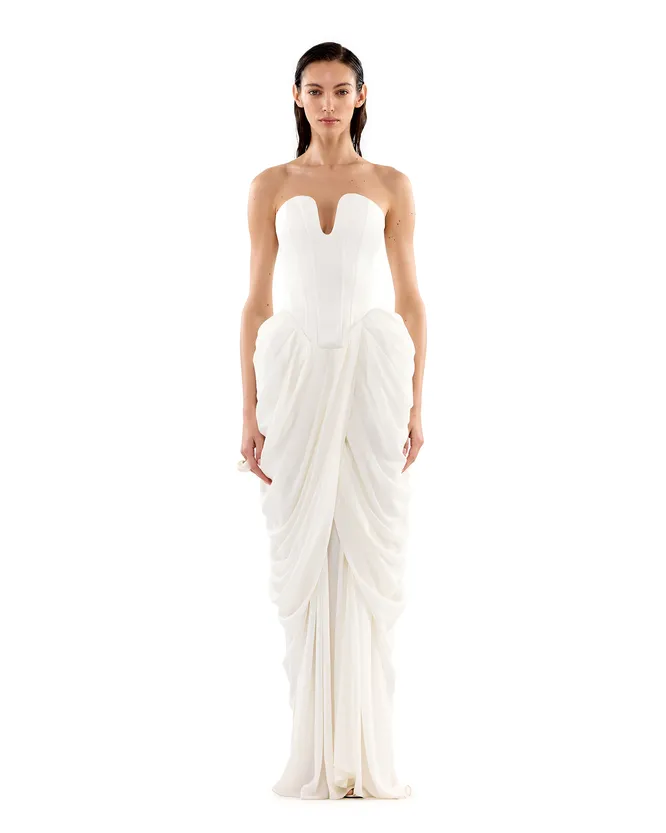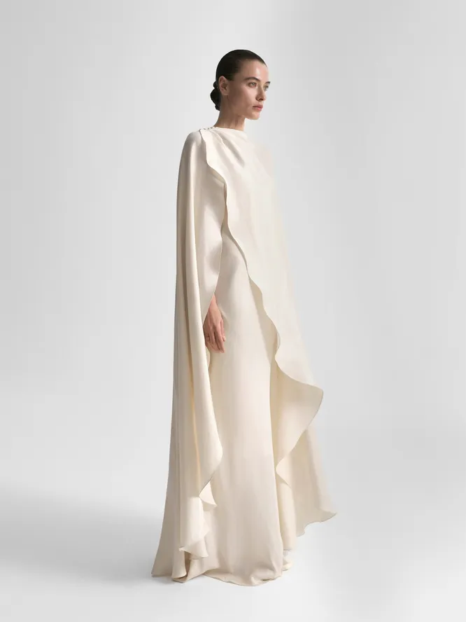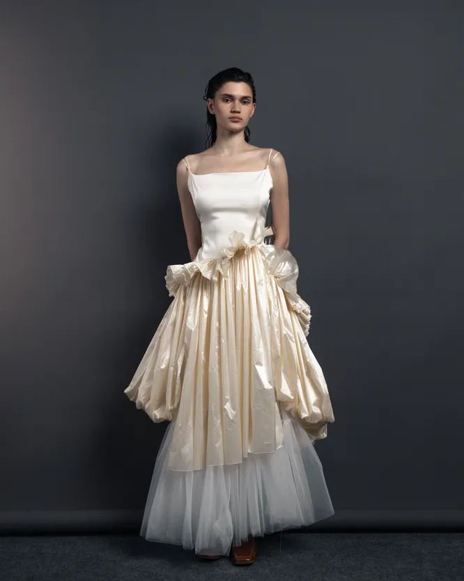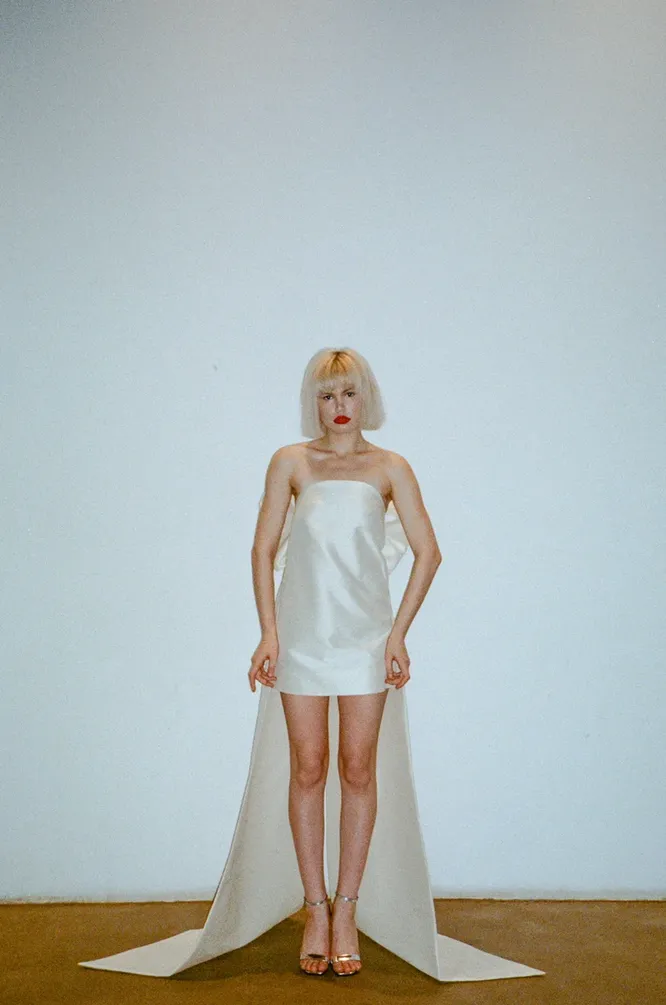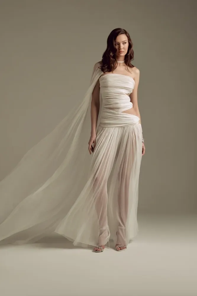 Рискнем предложить, что добрая половина всех вирусных платьев с драпировками, которые взорвали соцсети, – авторства Say No More. Поэтому более чем естественно, что и в свадебной нише бренд выступил эффектно. Платья из линейки, кстати, можно отшить по своим меркам.