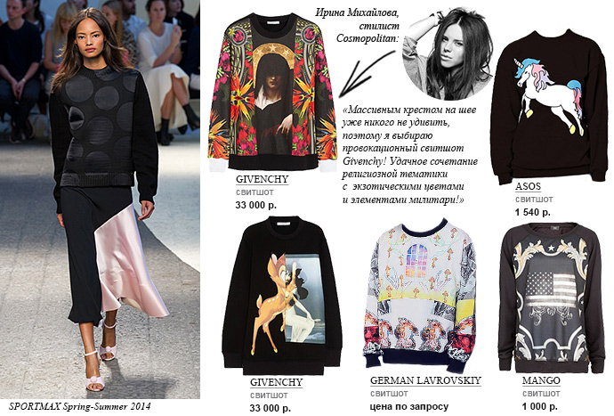 С тигром, губами, помадами, глазами, религиозной символикой, копиями известных картин и провокационными слоганами — в этом, да и в будущем сезоне, свитшоты есть в коллекциях практически всех модных марок: от Alexander Wang и Givenchy до Kenzo и Sportmax.
