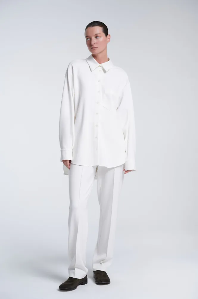 Пока тепло, можно выгулять легкие рубашки с короткими рукавами — в компанию к ним берем трикотажные палаццо из комплекта, кожаную сумку и сандалии, чтобы сделать аутфит более статусным. А когда погода испортится, на плечи накинь черный «мужской» пиджак — в комплекте с очками и аккуратной прической выйдет стильный и строгий образ.