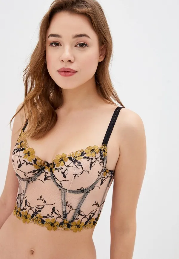 Этот комплект из прозрачного тюля с цветочной вышивкой – настоящее воплощение нарочитой женственности. Корсетный бюстгальтер не только красиво смотрится на груди, но и хорошо ее поддерживает, а также формирует гармоничный силуэт. Стринги с разрезами на бедрах добавляют комплекту изюминку и создают органичный контраст нежности и страсти.