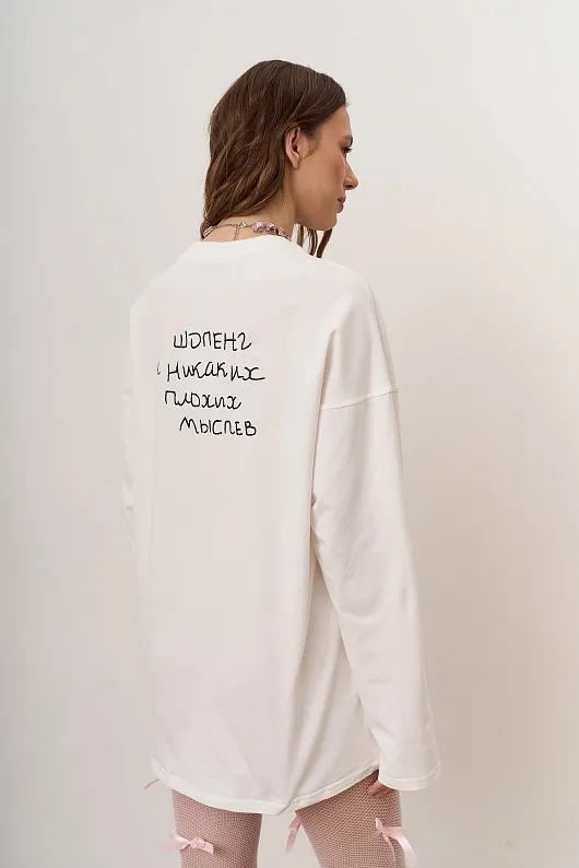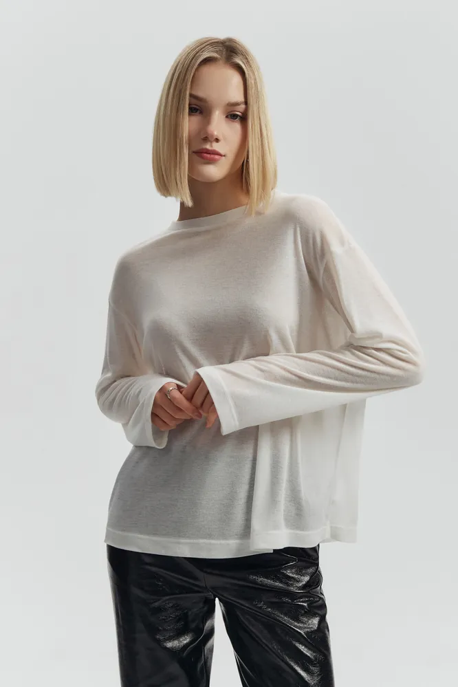 К тонкому трикотажу мы всегда относимся с осторожностью, потому что облегающие модели из такого материала могут подчеркнуть недостатки твоей фигуры и визуально добавить несколько килограммов. Но в случае с этим лонгсливом подобная проблема нам не страшна — спасибо прямому силуэту! Невесомая светлая ткань сделает аутфит более романтичным и будет прекрасно выглядеть на фоне контрастных брюк из искусственной кожи.