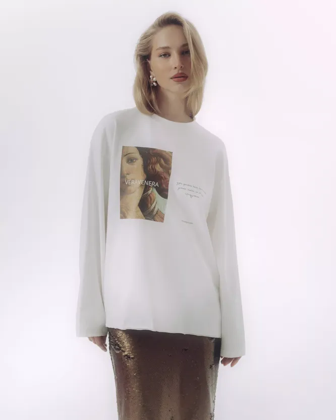 Лонги с принтами известных картин, скульптур или мифологических героев выглядят очень стильно и выполняют еще одну важную функцию — популяризируют искусство! Попробуй примерить такой лонгслив с однотонной атласной юбкой в пол, туфлями на каблуке – и отправляйся на свидание в музей.