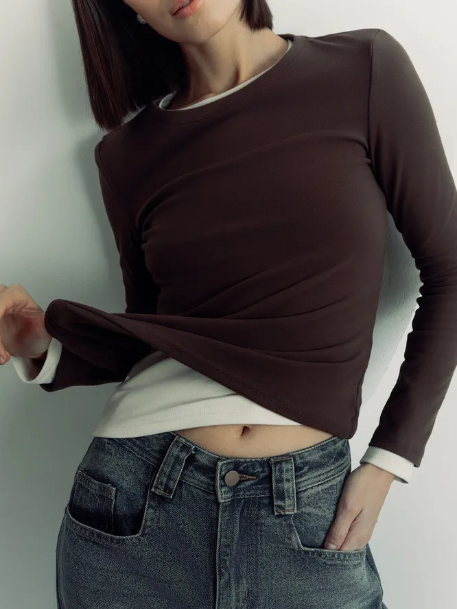 Двойной лонгслив, который можно считать еще одним «всадником» Y2K, – это в действительности две контрастных футболки с длинным рукавом, которые можно носить как вместе, так и по отдельности. Вариация с лонгами в шоколадном и сливочном оттенах – наша любимая.