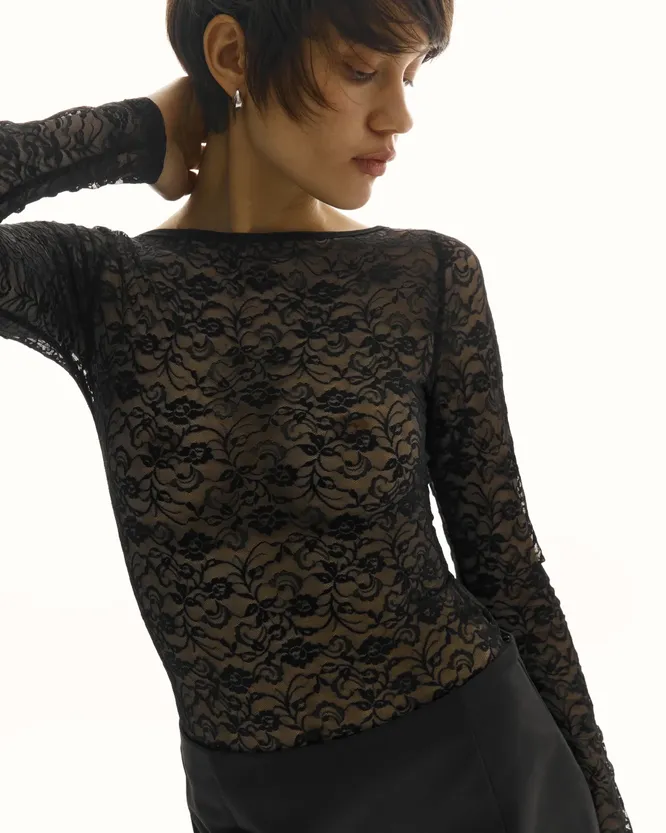 Кружевной лонгслив — тоже база, но не для повседневных образов, а для вечерних аутфитов. С полупрозрачной темной моделью можно составить огромное количество стильных нарядов. Попробуй дополнить кружево длинной юбкой из атласа и объемным жакетом или брючным костюмом — сдержанный и в то же время очень привлекательный образ на выход готов!