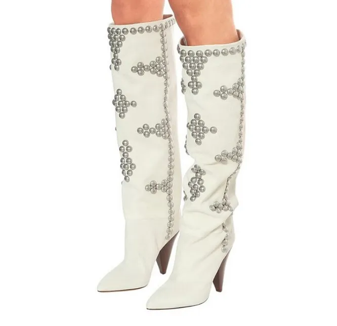 Белые замшевые сапоги на модном конусообразном каблуке, декорированные металлическими клепками, могут стать главным акцентом в твоем образе. Они будут отлично сочетаютя как с темной, так и со светлой верхней одеждой – от классической шубы или элегантного пальто до уютных пуховиков-одеял.