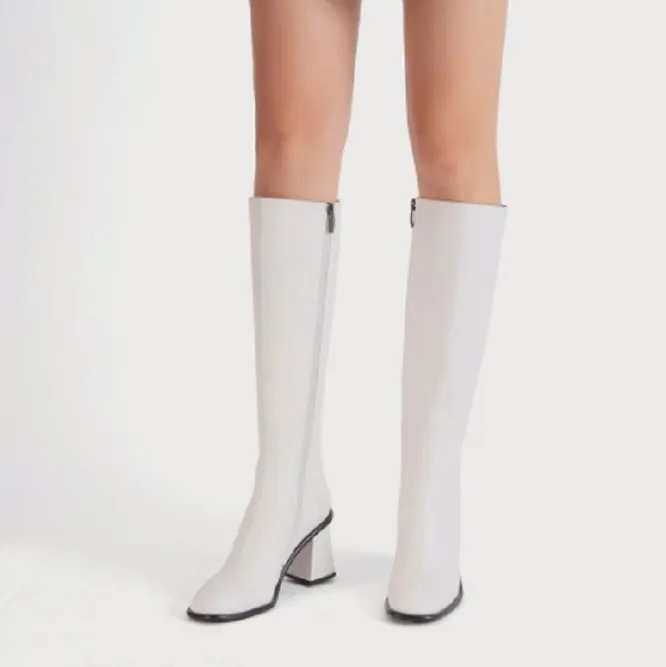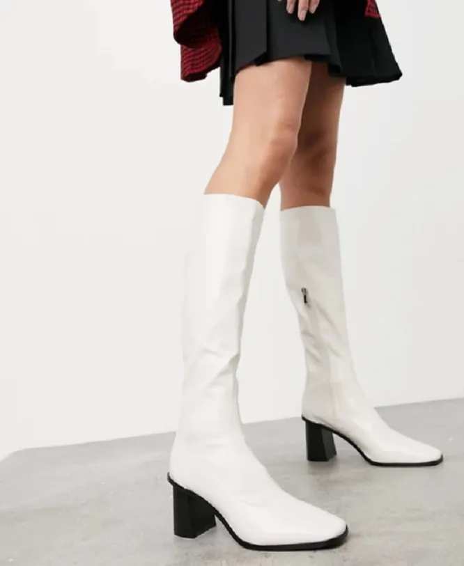 Не менее стильно смотрятся и белые высокие сапоги на черном наборном каблуке. Эта модель помимо оттенка самих сапог соответствует еще как минимум двум актуальным трендам: квадратный устойчивый каблук и квадратный же носок обуви. Сапоги отлично сочетаются с одеждой любого цвета, но особенно эффектно смотрятся с чем-нибудь черным, бордовым, белым, также они отлично впишутся в капсулу в пастельных оттенках. Носить их можно как с одеждой классического стиля, так и с молодежной.