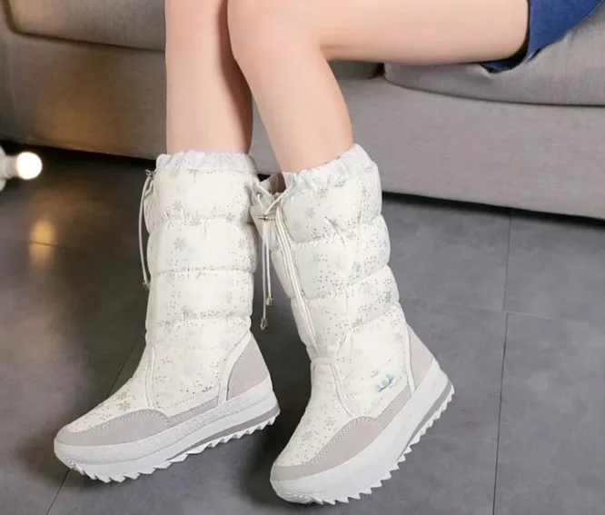 Белые зимние сапоги из нейлона с замшевыми вставками, рисунком-снежинками и с пушистым мехом внутри, по дизайну напоминающие «луноходы», не будут скользить на льду и согреют в мороз. С помощью шнурка в области голенища ты можешь затянуть их точно по ноге – и смело ходить по сугробам. Носи их с теплыми джоггерами, джинсами, пуховиками и другой максимально удобной одеждой – особенно хорошо они сочетаются с одеждой спортивного стиля.
