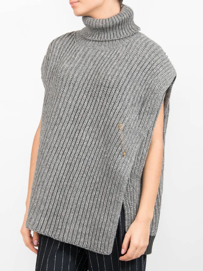 Удлиненная простая безрукавка – прекрасная альтернатива привычным свитерам с высоким горлом и шерстяным водолазкам. Вещь подойдет для стильных многослойных комплектов.